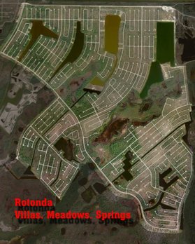| Rotonda Villas and Meadows are situated together east of 771 north of Placida, and just below South Gulf Cove. Several lakes provide attractive views. The entire development is surrounded by the Charlotte Harbor Buffer Preserve to the East and South. The Meadows, (the northern-most section), currently has approximately 2200 build-able lots. The Villas, (the middle section), currently has about 2400 build-able lots. The Springs, (the southern-most section), are located at the far South Eastern end of the villas. Most of these lots have been put in the state buffer preserve lands, and today, only about 300 build-able lots remain. Future sewer installation is pending. The Meadows, Villas, and Springs currently mostly lack utilities, including electric service. There are a few homes in these areas today, as power lines now just intersect the West and Northern edge of the Meadows. | |